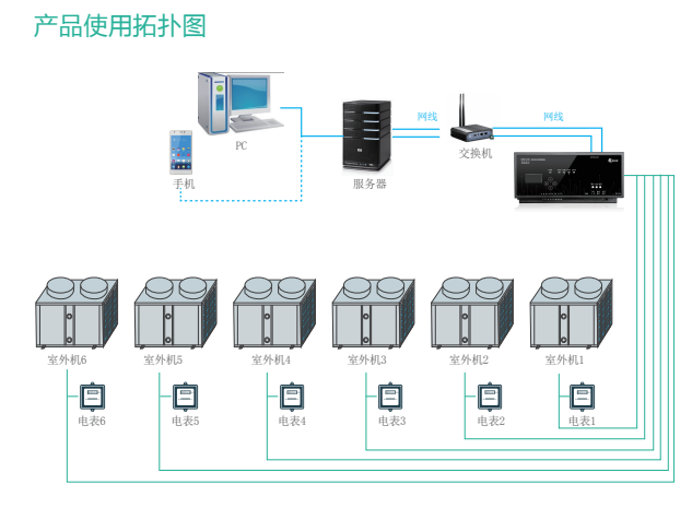 廣州派谷多聯(lián)機(jī)空調(diào)節(jié)能控制系統(tǒng)構(gòu)建了 “終端設(shè)備 - 數(shù)據(jù)采集 - 網(wǎng)絡(luò)傳輸 - 平臺(tái)分析 - 智能調(diào)控” 的完整閉環(huán)(結(jié)合 “產(chǎn)品使用拓?fù)鋱D” 可見):醫(yī)院多聯(lián)機(jī)系統(tǒng)的每臺(tái)室外機(jī)均配套獨(dú)立電表,實(shí)時(shí)采集能耗數(shù)據(jù);電表通過通訊線路將數(shù)據(jù)傳輸至交換機(jī),再經(jīng)網(wǎng)絡(luò)匯聚到服務(wù)器進(jìn)行存儲(chǔ)與分析;服務(wù)器端搭載的節(jié)能控制平臺(tái),集成物聯(lián)網(wǎng)、大數(shù)據(jù)分析與智能算法模型,可對(duì)多聯(lián)機(jī)運(yùn)行狀態(tài)、能耗水平進(jìn)行多維度解析;管理人員通過 PC 端或手機(jī)端的可視化界面,遠(yuǎn)程查看系統(tǒng)運(yùn)行參數(shù)、能耗趨勢(shì),并執(zhí)行調(diào)控指令,實(shí)現(xiàn) “分散設(shè)備、集中管控”。